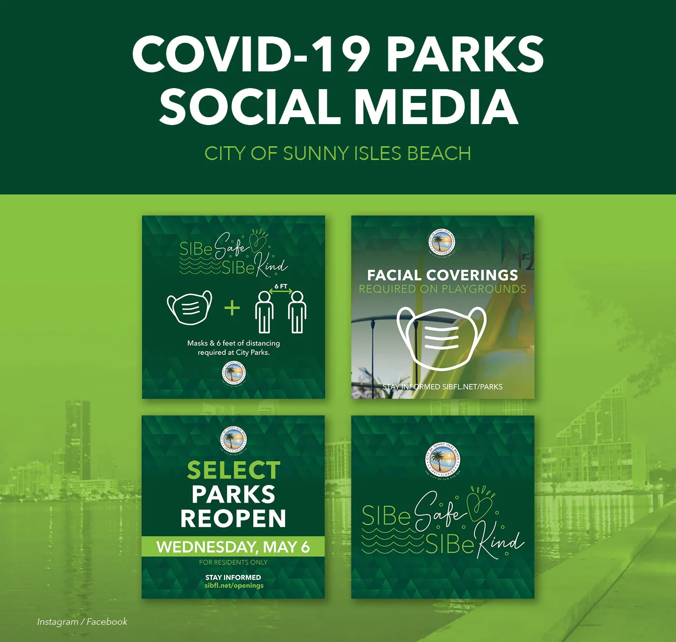 After precautions were taken the City of Sunny Isles Beach began a slow open in accordance with Miami-Dade County mandates. The required a new set of creative. One that would remind patrons and citizens to be safe while outdoors and follow safety procautions.
